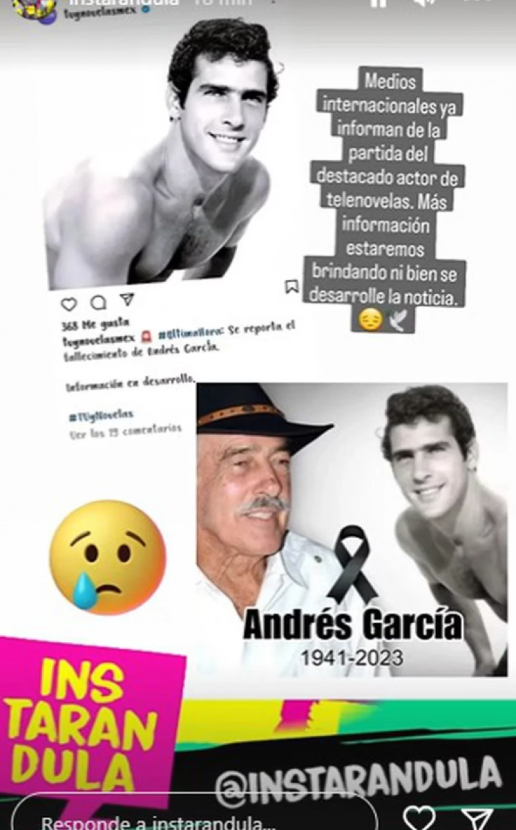 El portal web Instarándula, de Samuel Suárez hizo lo propio y difundió la noticia confirmada de la muerte de Andrés García. El periodista reaccionó con una cara llorando.