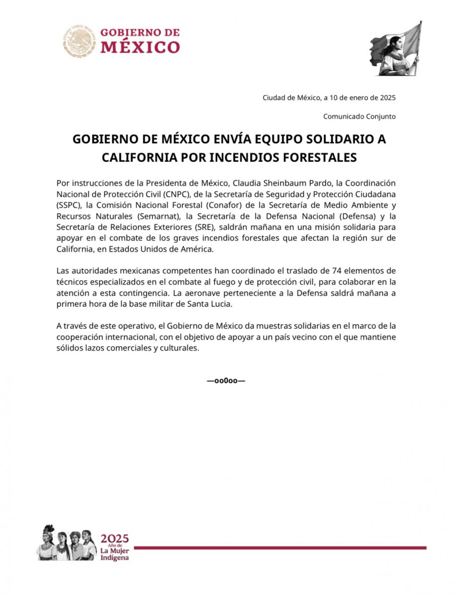 México ha informado que, por instrucciones de la presidenta Claudia Sheinbaum, enviará 74 técnicos especializados en combate de incendios y protección civil para apoyar a las autoridades locales en los esfuerzos de extinción. El grupo partirá el sábado por la mañana desde el Estado de México.