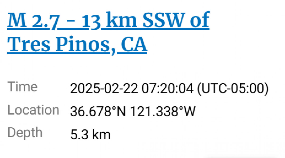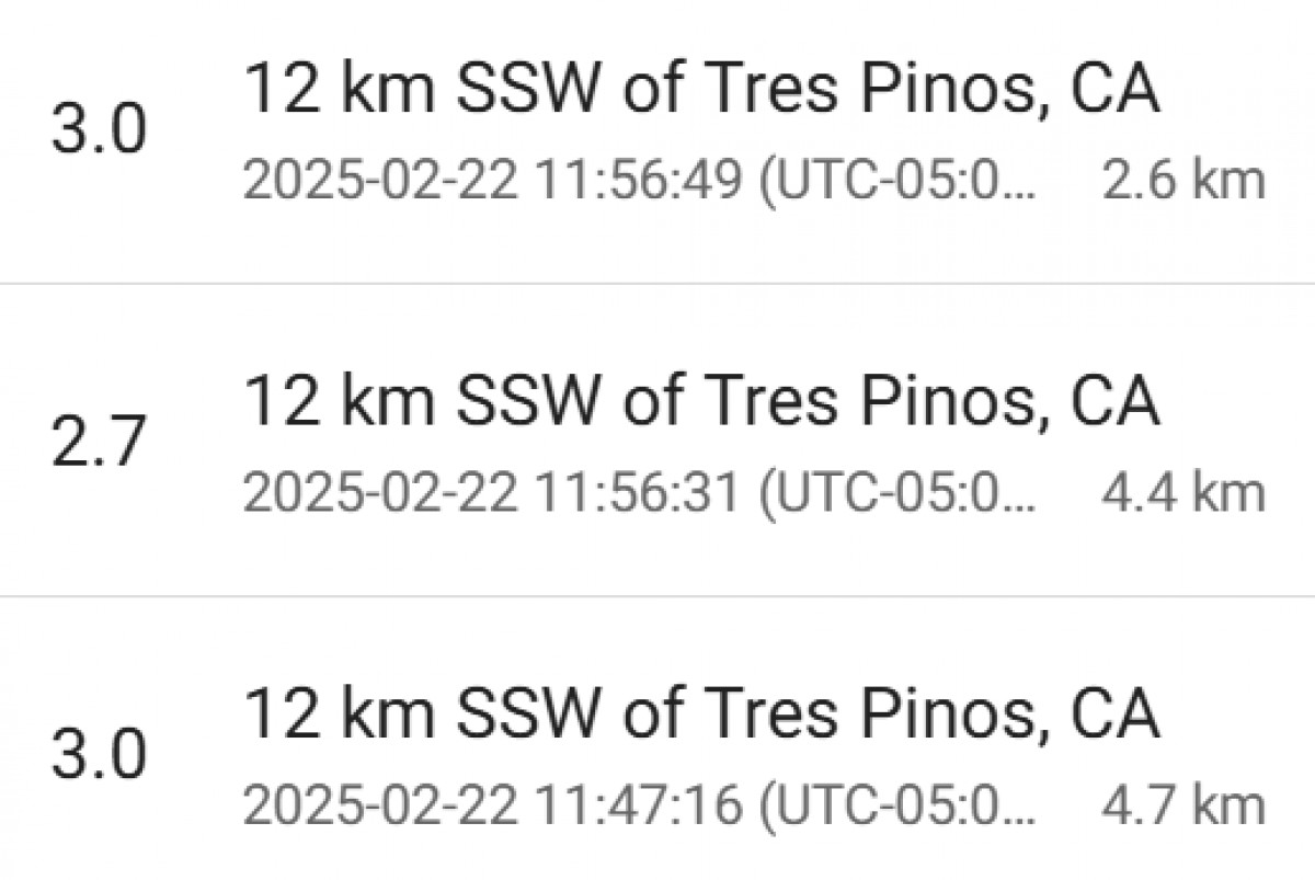 USGS reporta una serie de sismos seguidos en Tres Pinos, CA