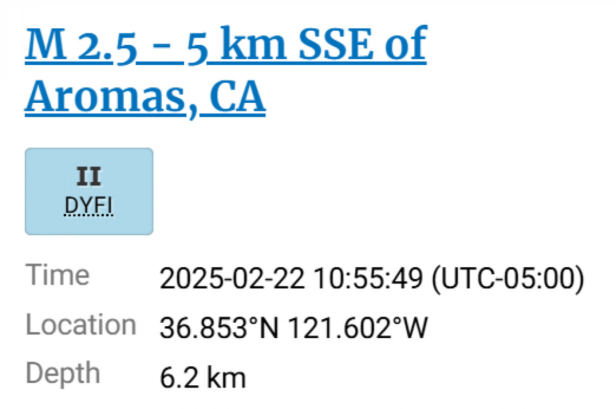 El Servicio Geológico de Estados Unidos reportó un sismo en Aromas, California.