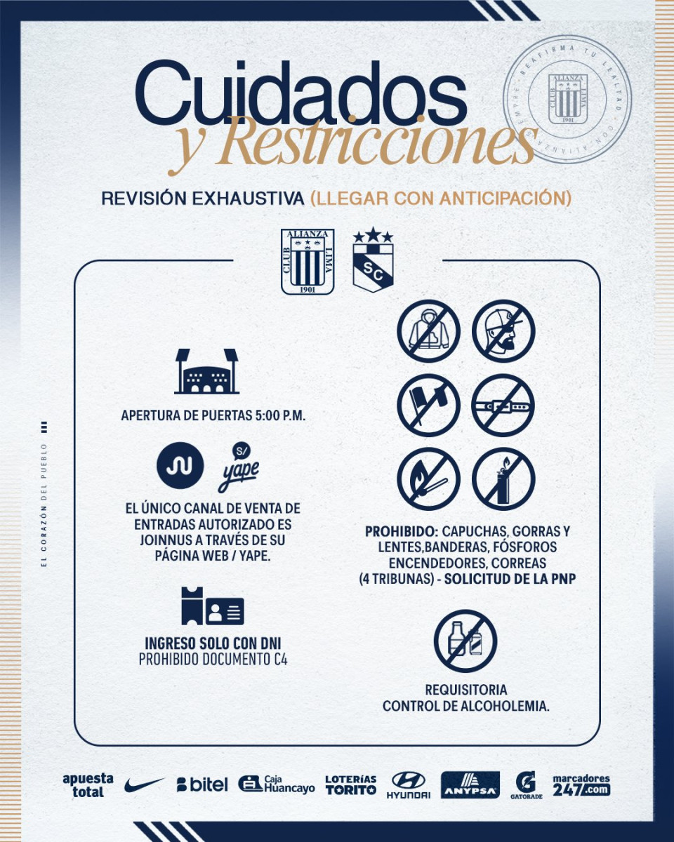 Conoce los cuidados y restricciones que debes tener en cuenta para el partido de este martes 5 en el Alejandro Villanueva. Las puertas se abrirán desde las 5.00 p. m. Foto: Club Alianza Lima