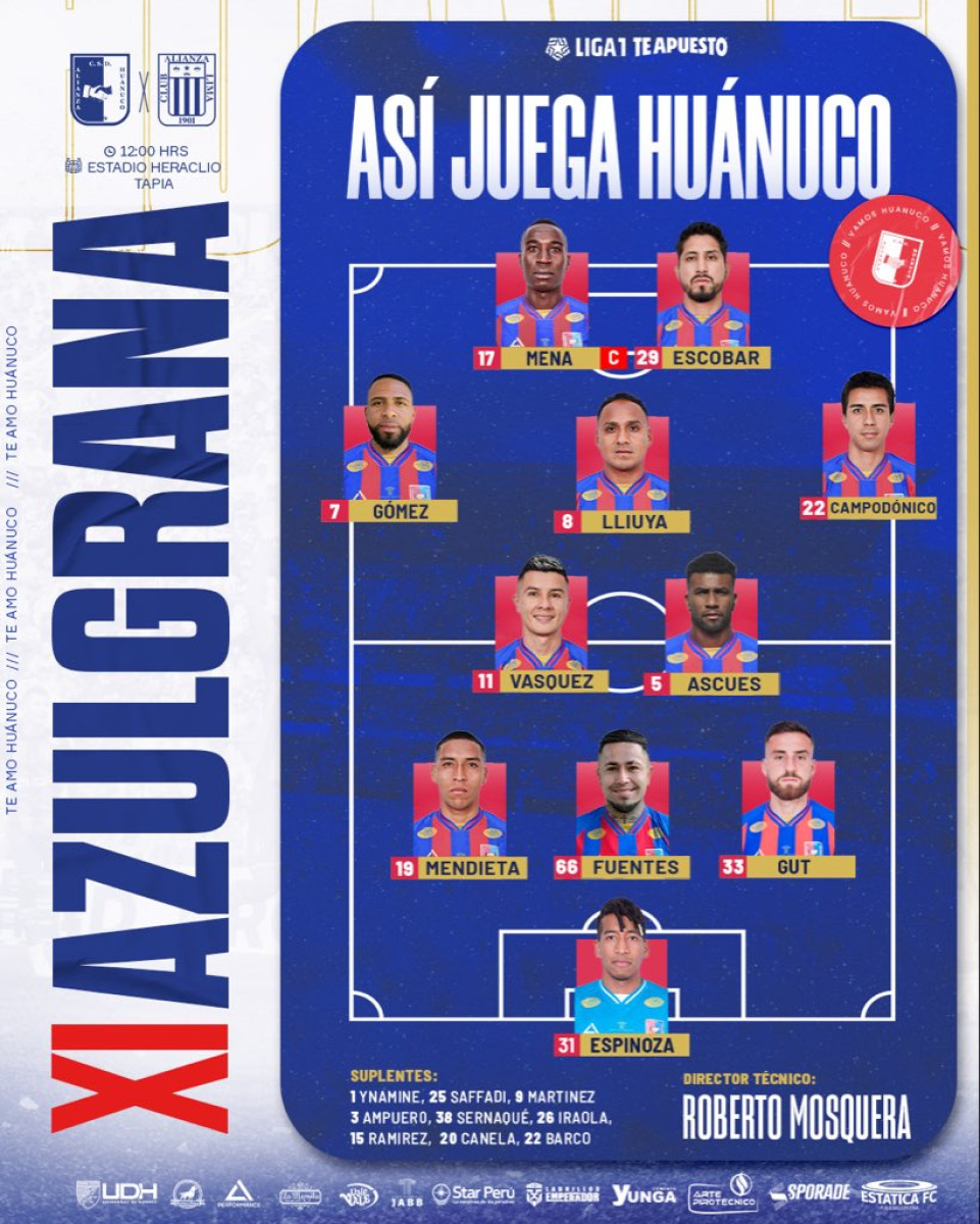 Esta es la once titular de los locales: Espinoza, Mendieta, Gut, Fuentes, Gómez, Vásquez, Lliuya, Ascues, Campodónico, Escobar y Mena. Foto: Alianza UDH