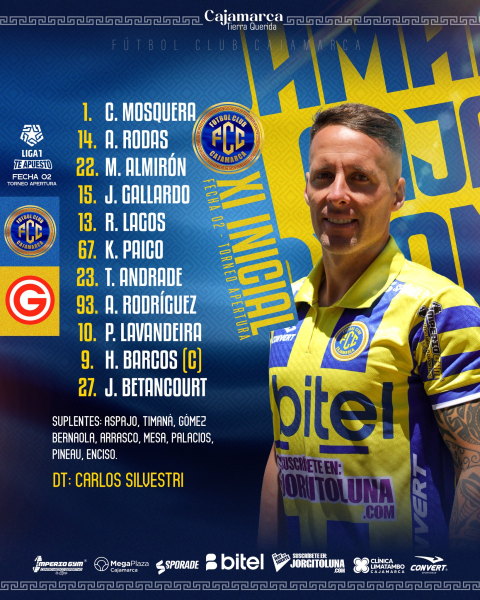 Mosquera, Rodas, Almirón, Gallardo, Lagos, Paico, Andrade, Rodríguez, Lavandeira, Barcos, Betancourt. Foto: FC Cajamarca