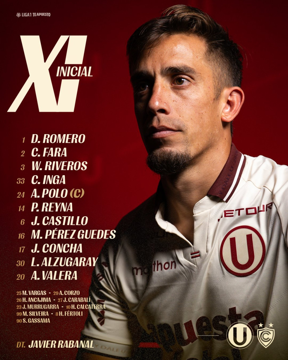 - Universitario: Diego Romero; Ánderson Santamaría, Caín Fara, César Inga; Hugo Ancajima, Martín Pérez Guedes, Jesús Castillo, Jairo Concha, José Carabalí; Lisandro Alzugaray y Alex Valera.
