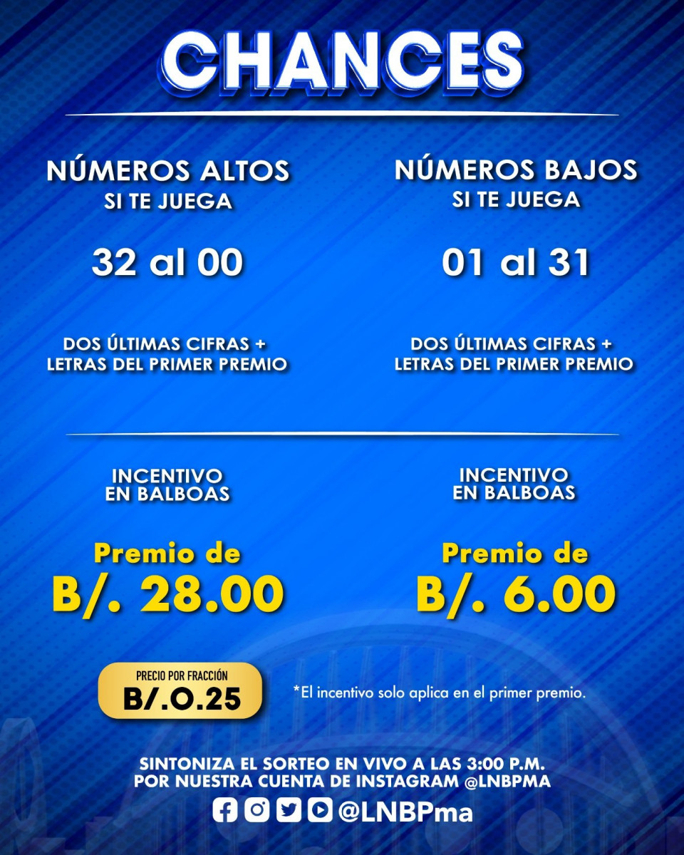 La Lotería incentiva chances que salen en el Primer Premio y que registra las letras ganadoras; si son números altos, comprendidos del 31 al 99 incluyendo el 00, paga B/ 28.00; si son números bajos (del 01 al 31), el premio adicional por fracción es de B/ 6.00. Para recibir este incentivo, el chance debe jugar en el primer premio y registrar las letras ganadoras.