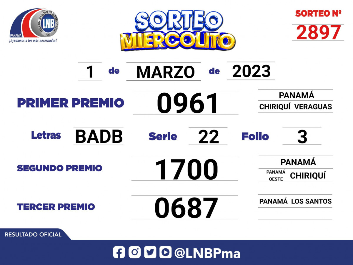 Revisa todos los resultados EN VIVO de la Lotería Nacional de Beneficencia (LNB) del 1 de marzo del 2023, en su modalidad 'Sorteo Miercolito'.