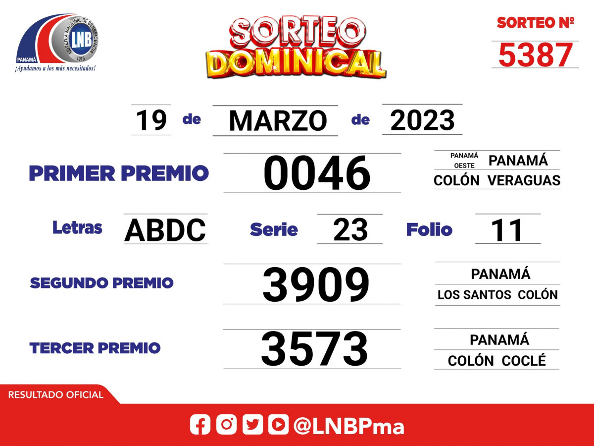 Los números ganadores se pueden conocer a través del sitio web oficial de la Lotería Nacional de Panamá y por sus cuentas de Twitter e Instagram. En esta sección colocaremos los resultados del sorteo dominical N.º 5387.