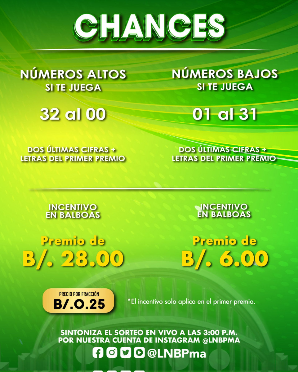 La Lotería incentiva chances que salen en el Primer Premio y que registra las letras ganadoras; si son números altos, comprendidos del 31 al 99 incluyendo el 00, paga B/ 28.00; si son números bajos (del 01 al 31), el premio adicional por fracción es de B/ 6.00. Para recibir este incentivo, el chance debe jugar en el primer premio y registrar las letras ganadoras.