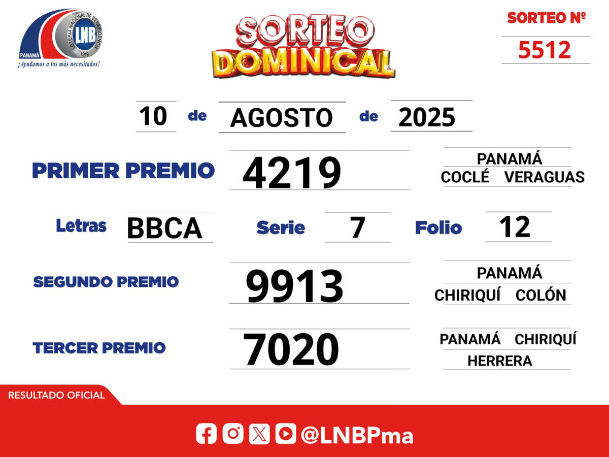 Resultados oficiales del Sorteo Dominical, 10 de agosto, de la Lotería Nacional de Panamá.
