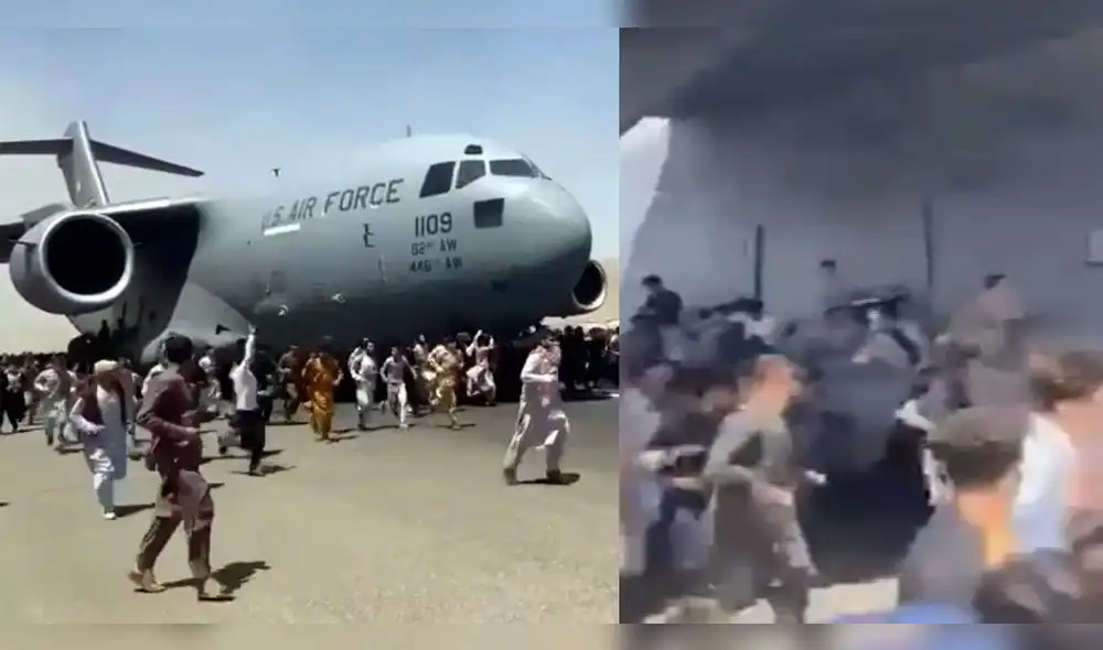 Las imágenes muestran a centenares de personas corriendo cerca de un avión de transporte militar estadounidense, que se dirige a la pista de despegue, con algunas de ellas intentado aferrarse a sus flancos o a las ruedas. Otros videos reflejan escenas de caos total en las pistas, con civiles peleándose por subir a las pasarelas o escaleras que conducen a los aviones.