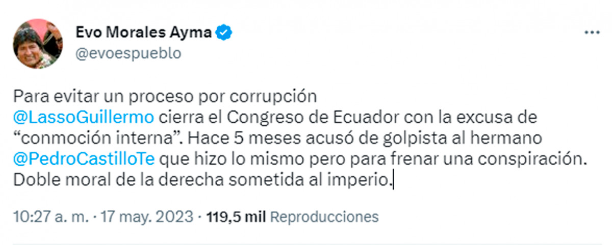 "Para evitar un proceso por corrupción Guillermo Lasso cierra el Congreso de Ecuador con la excusa de 'conmoción interna'. Hace 5 meses acusó de golpista al hermano Pedro Castillo, quien hizo lo mismo pero para frenar una conspiración. Doble moral de la derecha sometida al imperio", publicó el mandatario vía Twitter.