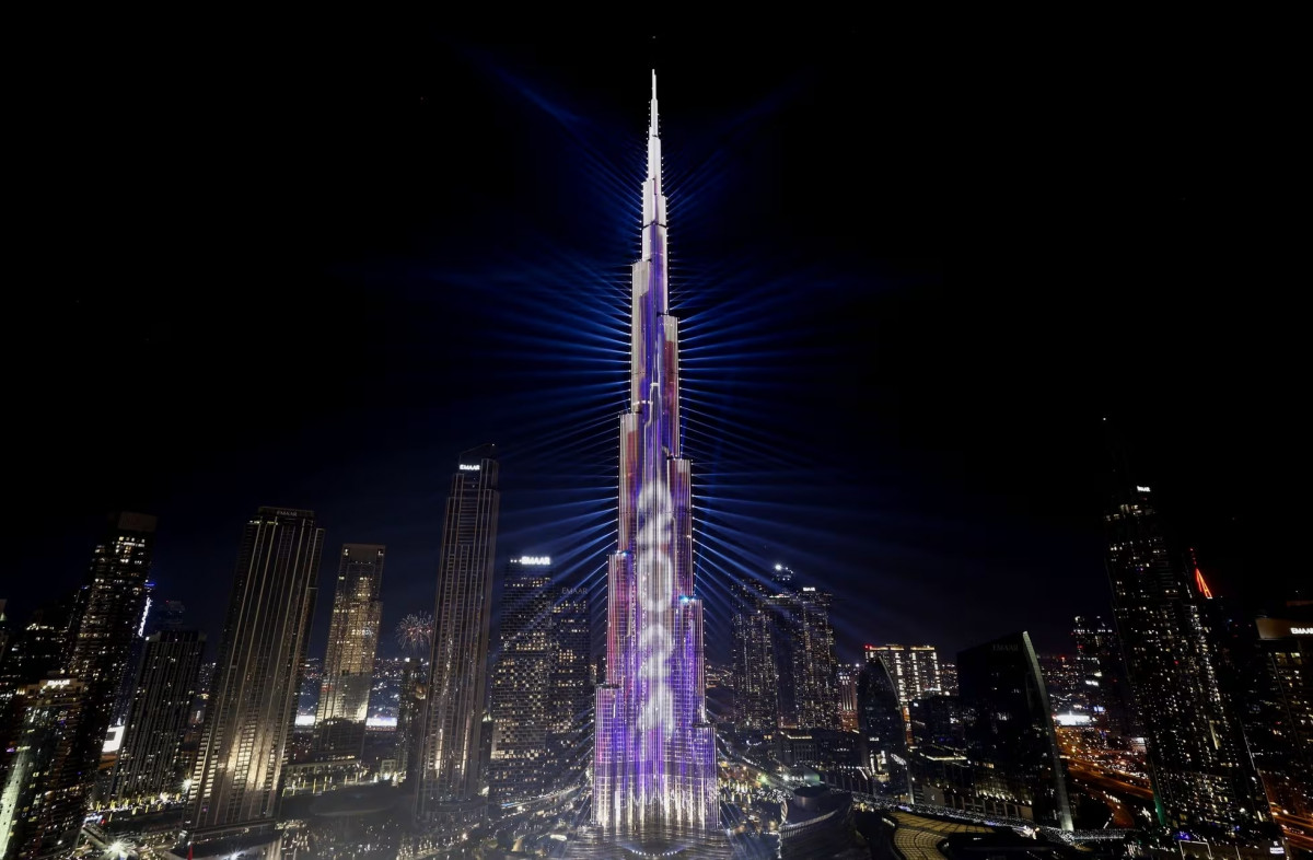 El edificio más alto del mundo, Burj Khalifa, recibió el Año Nuevo 2024 irradiando luz por toda su estructura.