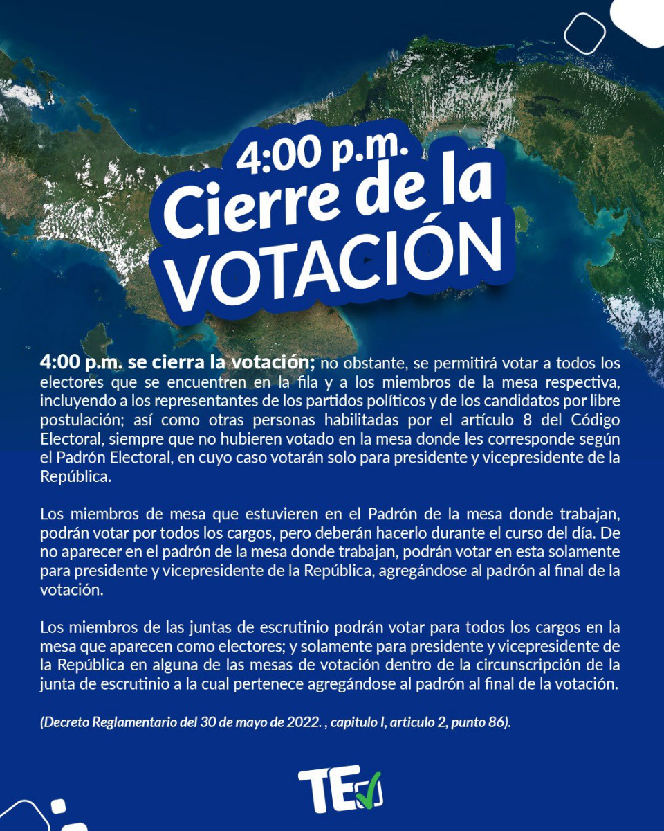 Las urnas en Panamá están programadas para cerrar a las 4.00 p. m. (hora local). Sin embargo, aquellos que se encuentren en fila para votar a esa hora podrán ejercer su derecho antes de que se proceda al cierre definitivo. Después de este momento, comenzará el conteo de votos, que se espera que concluya con la entrega de un informe preliminar antes de la medianoche.