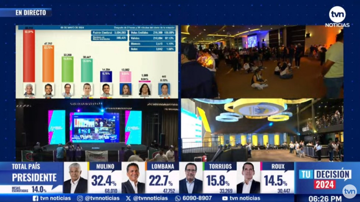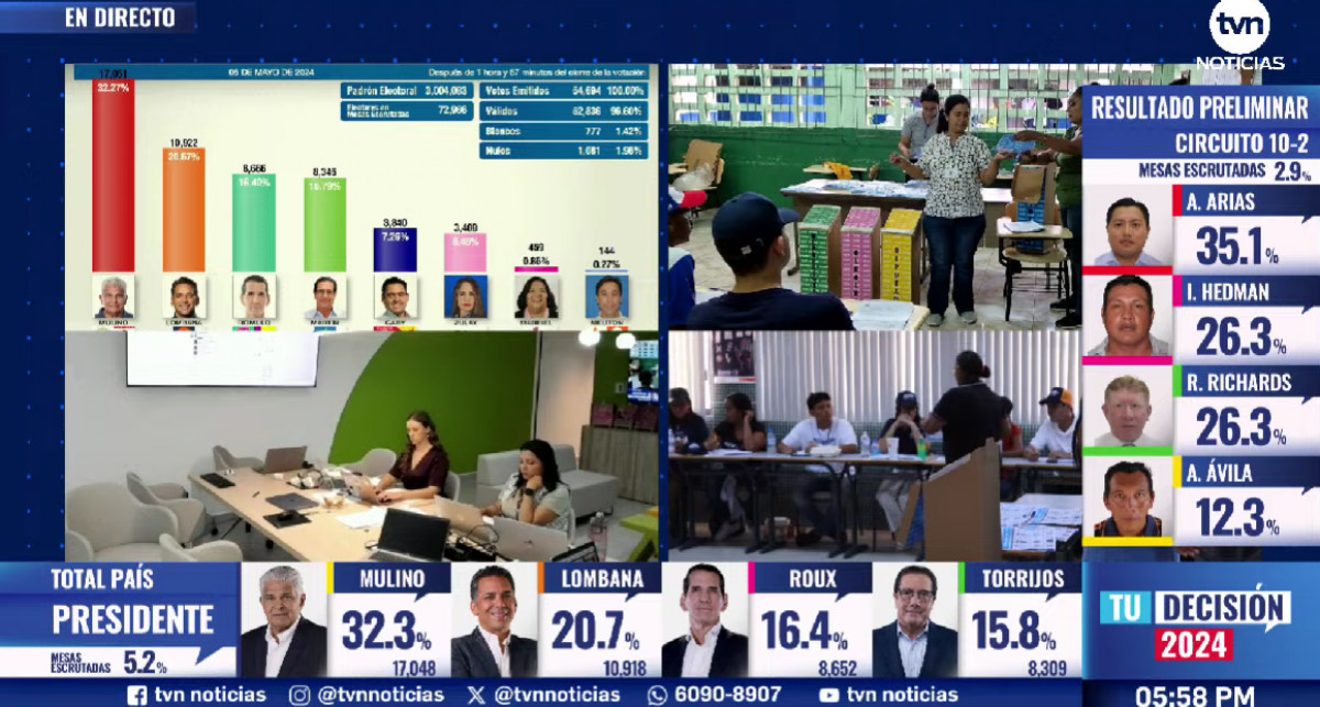 Al 5.2% de mesas escrutadas, el Tribunal Electoral (TE) señala que el José Raúl Mulino se posiciona en primer lugar en las elecciones presidenciales en Panamá con 32.3%.