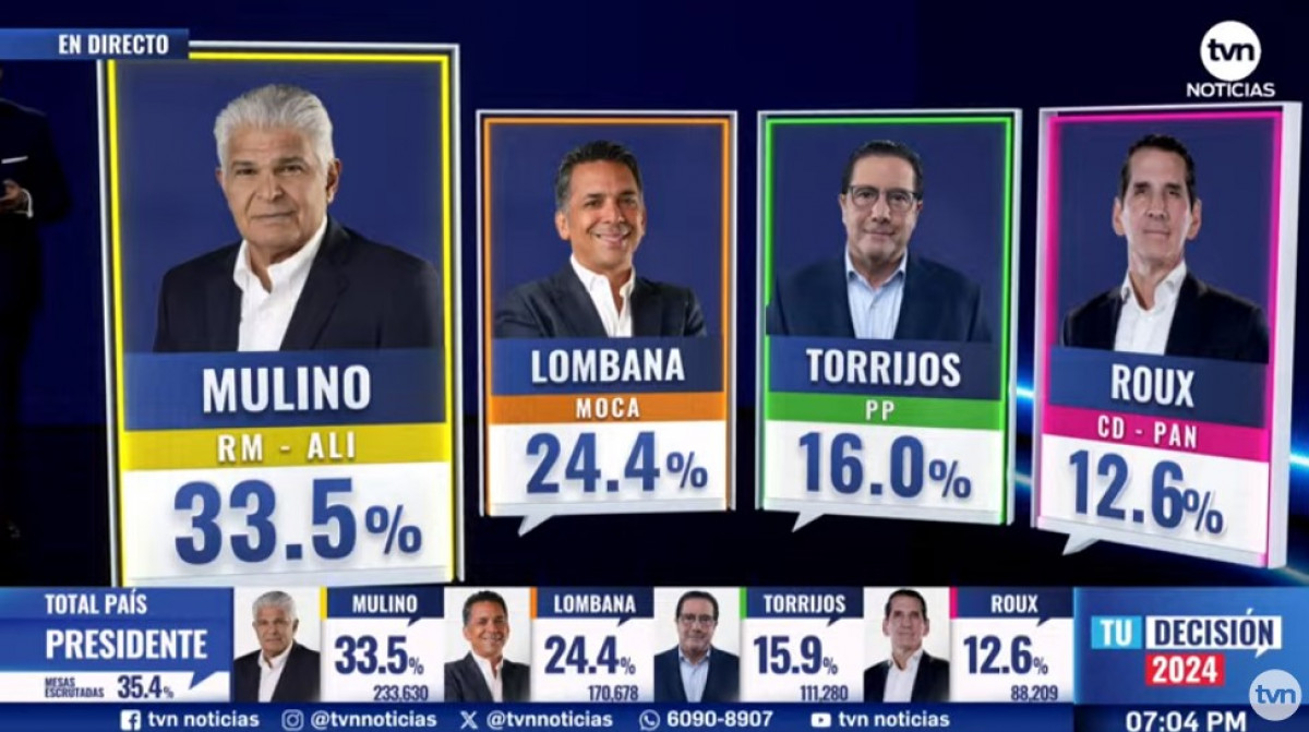 Tras haber cerrado las mesas electorales a las 4 horas, José Raúl Mulino se posciona en el primer lugar con el 34.99% de los votos contabilizados-