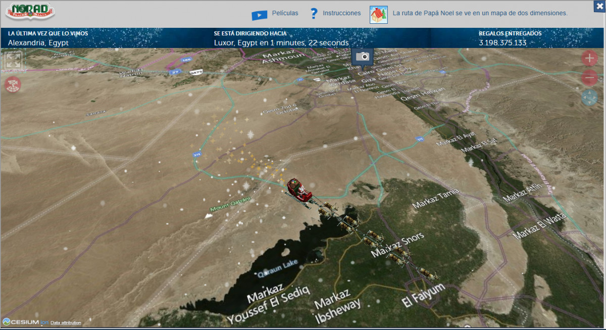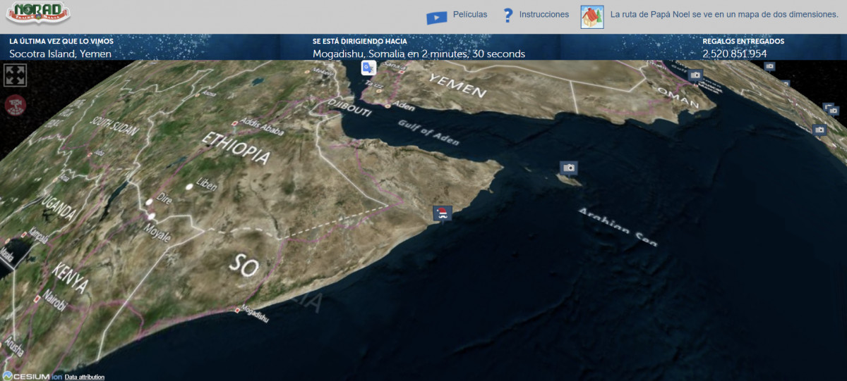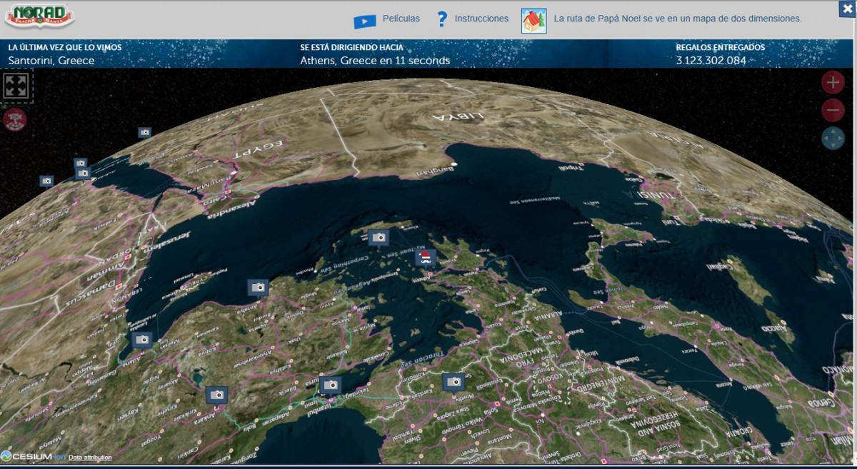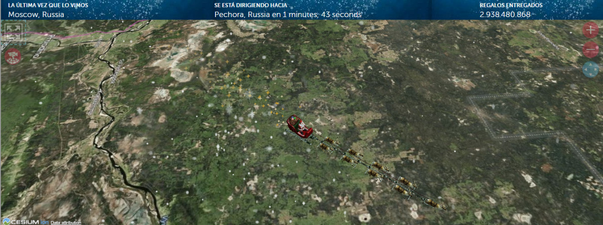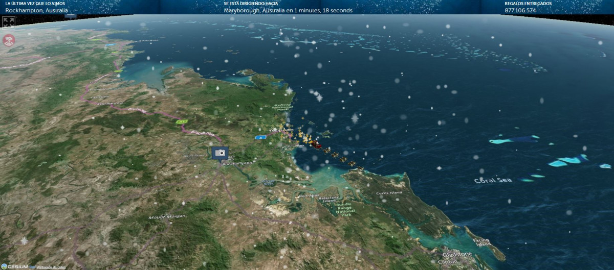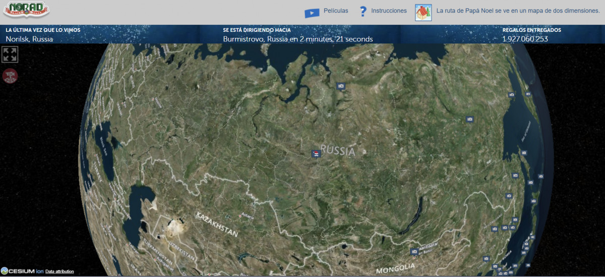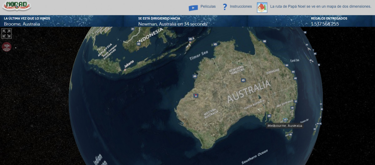 El rastreador en línea muestra un mapa en 2D o 3D de dónde se vio por última vez a Santa Claus, hacia dónde se dirige y cuántos regalos se han entregado hasta el momento.