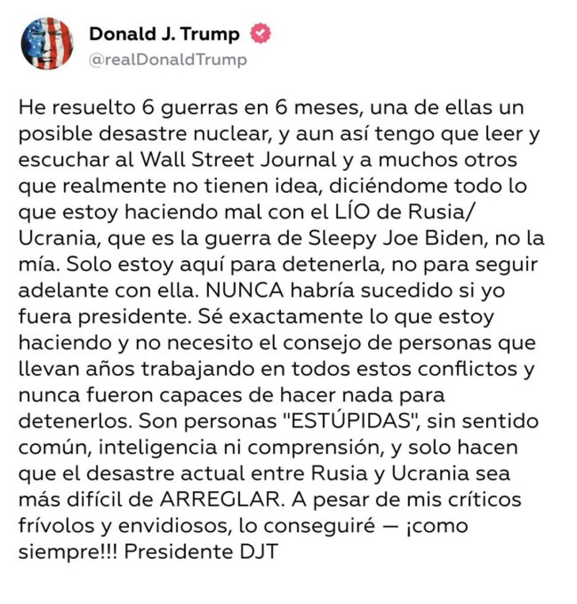 Trump también los llamó “gente estúpida, sin sentido común ni comprensión”, señalando que solo complican la solución al conflicto. Aunque prometió en campaña acabar con la guerra en 24 horas, esa meta aún no se ha concretado.