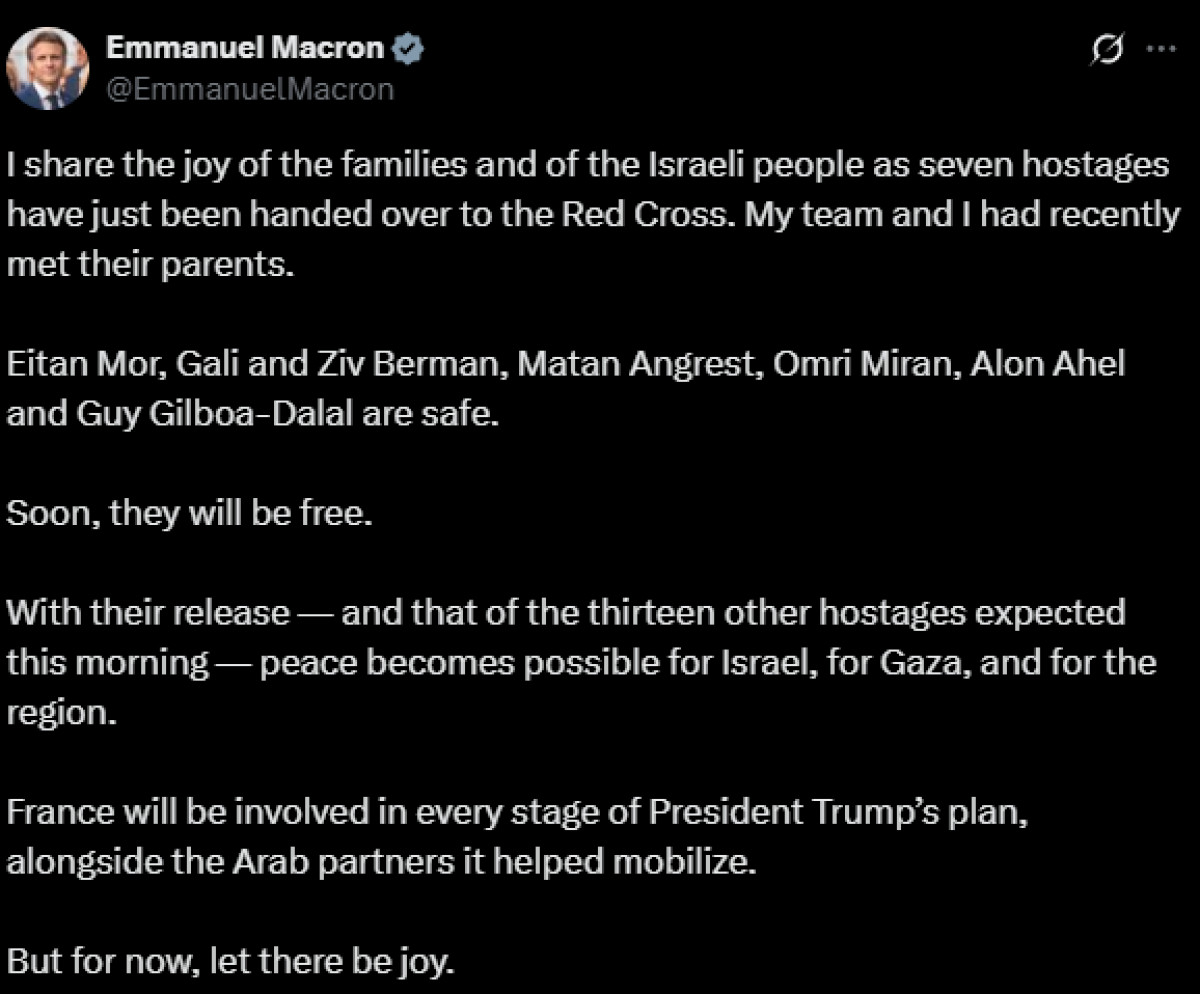 El presidente de Francia, Emmanuel Macron, expresó su solidaridad con las familias israelíes y el pueblo de Israel en un momento de esperanza, tras la entrega de un primer grupo de siete rehenes por parte de Hamas a la Cruz Roja. En un mensaje publicado en X, Macron afirmó: “Con su liberación, y la de los otros trece rehenes que se espera para esta mañana, la paz se hace posible para Israel, para Gaza y para la región”. Además, el mandatario francés destacó que su país estará presente en cada fase del plan propuesto por el presidente Trump, en colaboración con los socios árabes que ha logrado movilizar. Sin embargo, enfatizó que, por el momento, lo más importante es celebrar esta alegría.