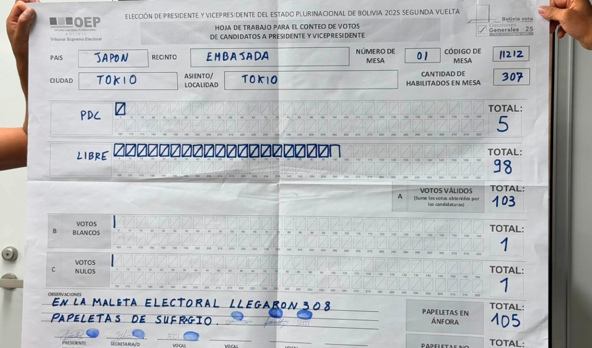 La primera mesa de votación habilitada en el exterior, en Japón, cerró con un total de 105 votos emitidos. La alianza Libre, que postula a Jorge Quiroga, obtuvo una victoria con 98 sufragios, frente a los 5 votos del PDC, liderado por Rodrigo Paz.