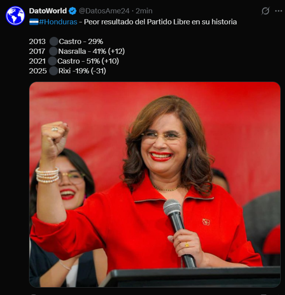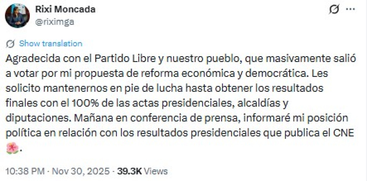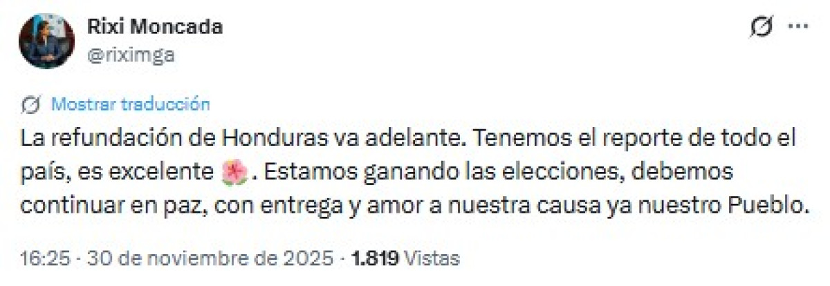 La representante de LIBRE, Rixi Moncada, se pronunció sobre los resultados que la alejan el puesto presidencial y se mantiene esperanza con algún cambio en ellos: "Las elecciones no están perdidas". Además, añadió que "mantendré mis posiciones y no me rindo. Estaré siempre del lado del pueblo con mis valores firmes en la defensa de mi patria libre y los principios de la no injerencia y la soberanía popular, la independencia y la autodeterminación de los pueblos"