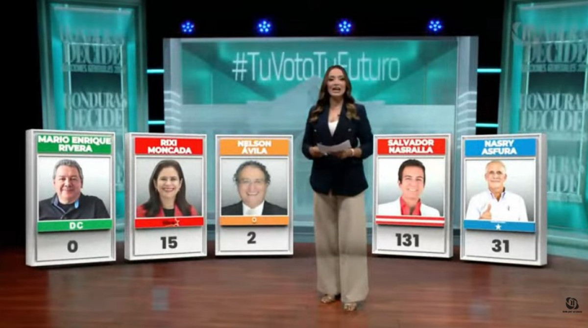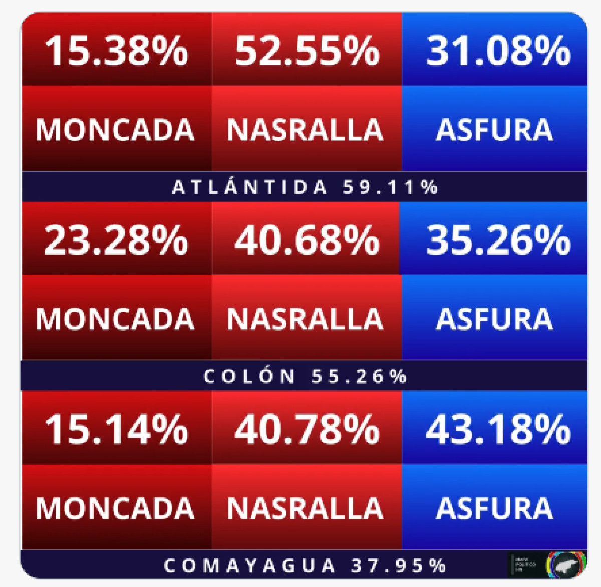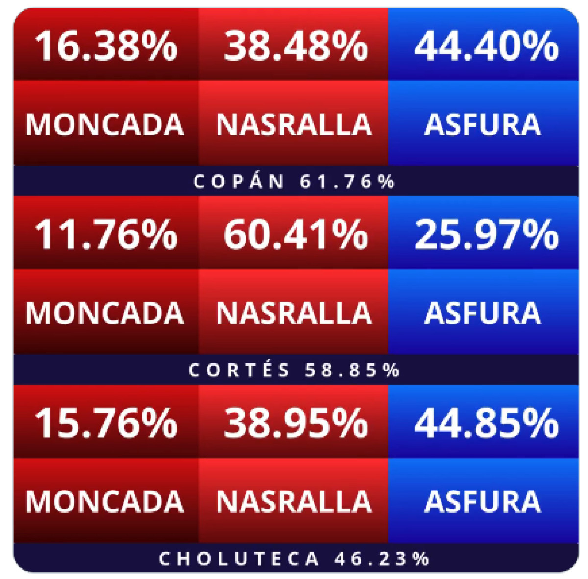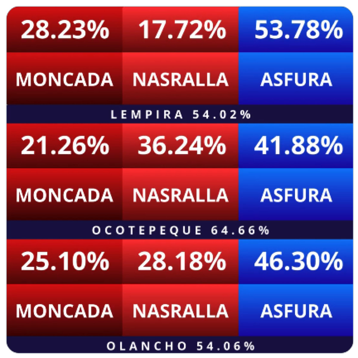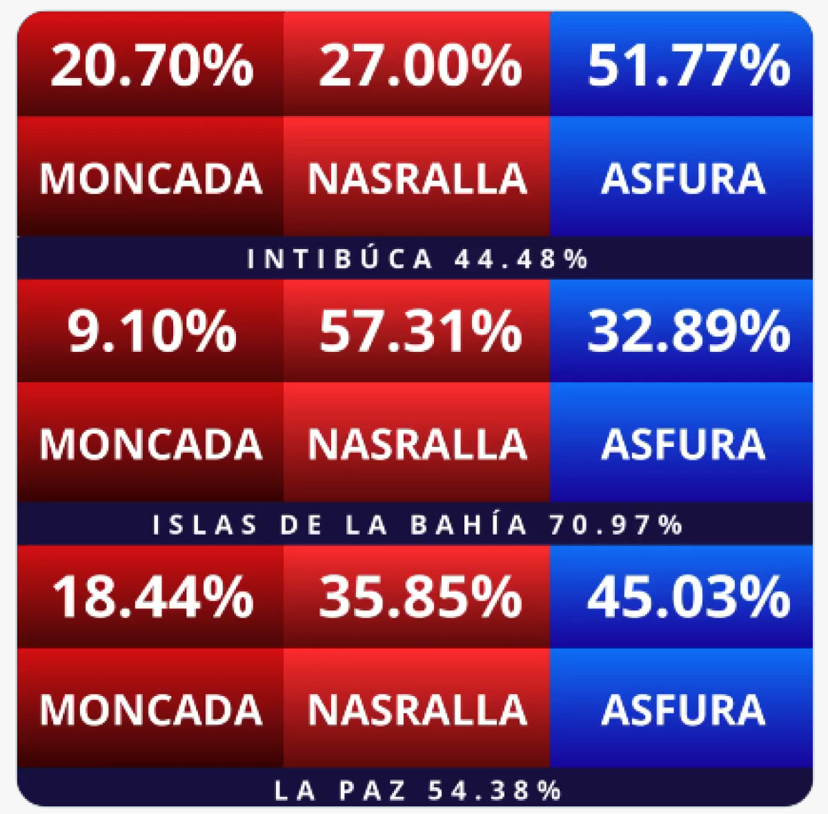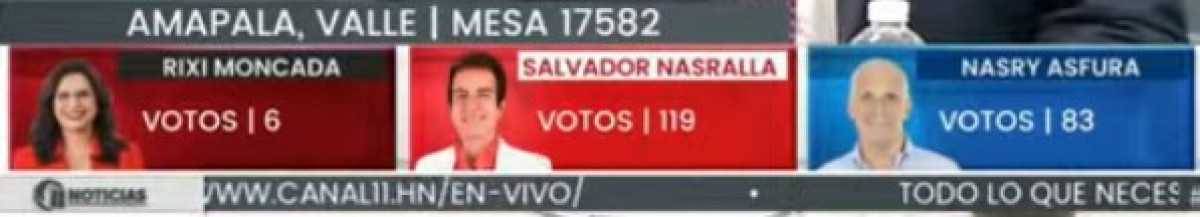 Hasta el momento, con los primeros conteos de votos, Salvador Nasralla y el Partido Liberal se van llevando los puntos. El Partido Nacional, de Nasry Asfura, le sigue. El menos mencionado es Rixi Moncada y su partido oficialista.