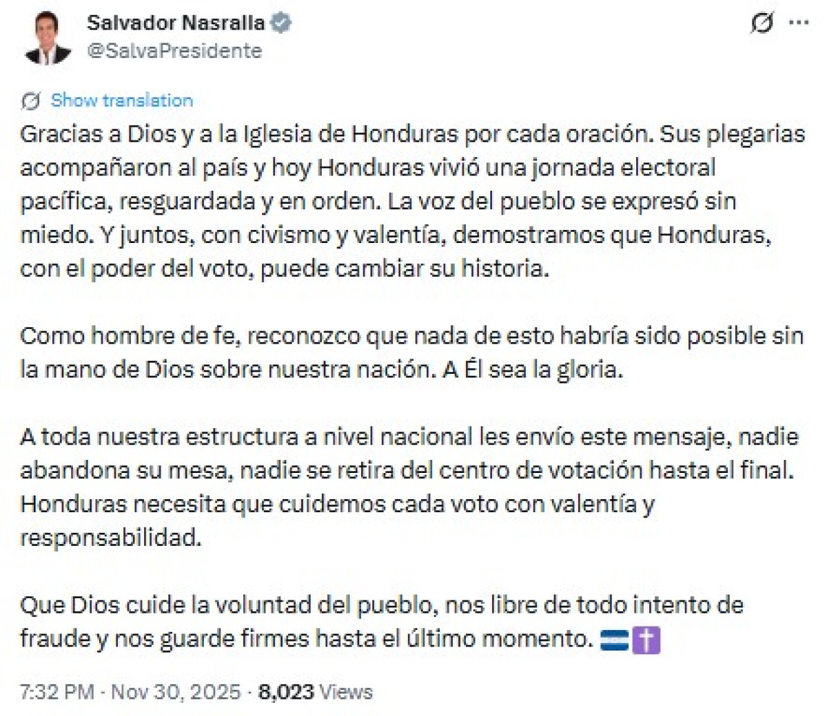Nasralla agradeció a todos los candidatos a diputados, alcaldes, miembros de mesa y votantes que participaron activamente en la jornada, así como al pueblo hondureño por su respaldo. “Gracias por su confianza y por defender el voto en cada Junta Receptora”, expresó.