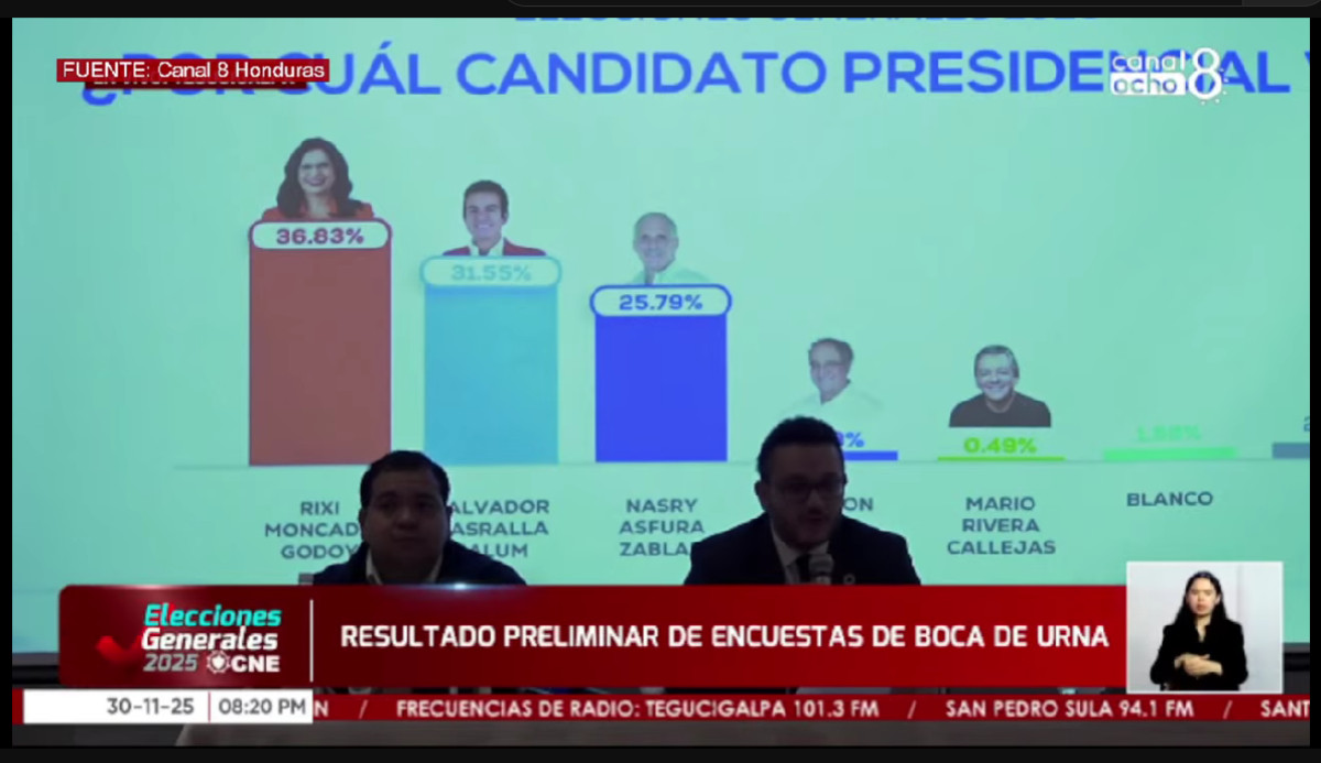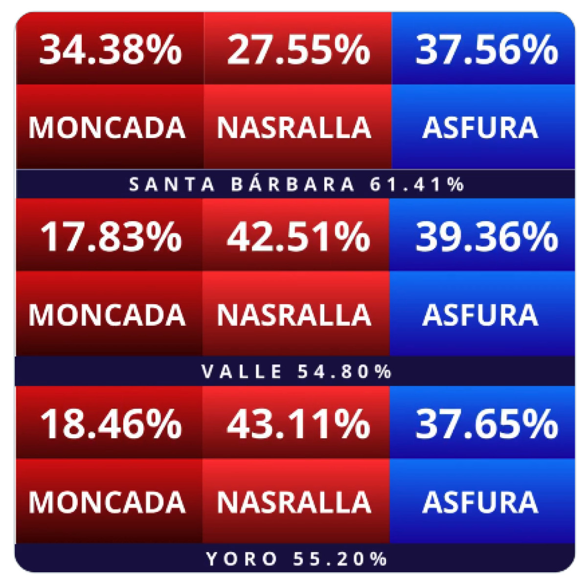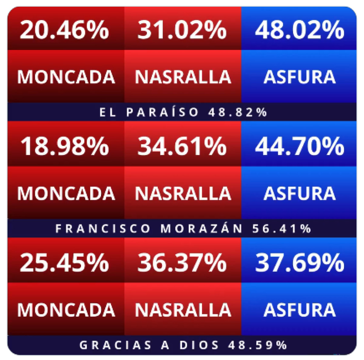 No obstante, la diferencia no es tan amplia como para descartar a Asfura, quien aparece en segundo lugar con un margen estrecho, lo que deja la contienda abierta hasta el cierre de urnas.