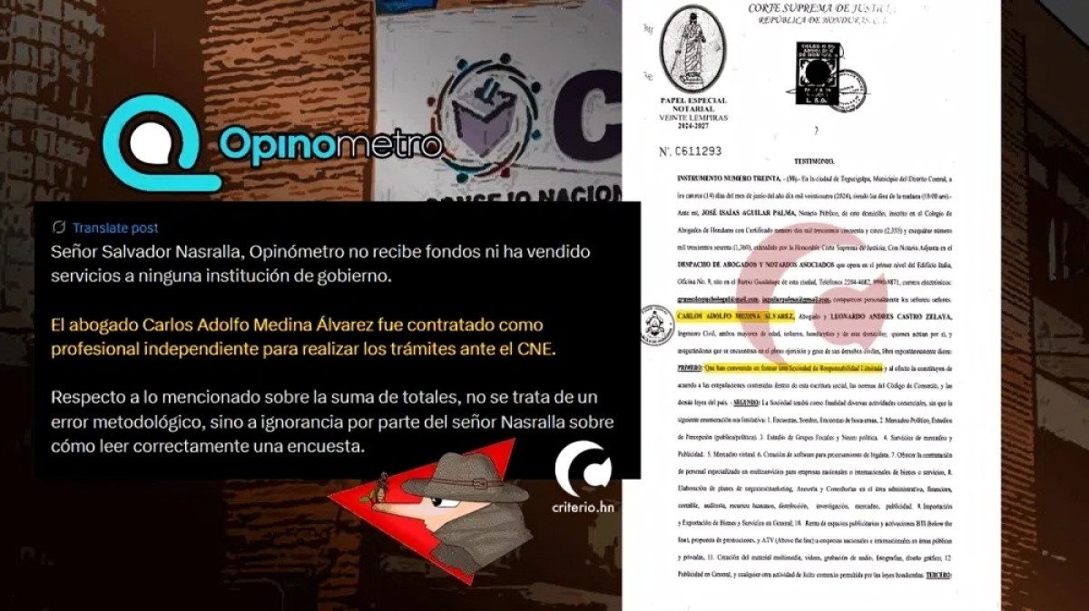 Según una investigación de Criterio.hn, Opinómetro —que afirma que el abogado Carlos Adolfo Medina Álvarez fue contratado solo como profesional independiente para trámites ante el Consejo Nacional Electoral (CNE) — en realidad fue fundado en junio de 2024 por él mismo junto a otro socio, según el acta constitutiva registrada públicamente, lo que pone en duda su neutralidad. Además, Medina Álvarez mantenía vínculos laborales recientes con la Secretaría de Desarrollo Social (Sedesol), generando fuertes interrogantes sobre un posible conflicto de interés en medio del proceso electoral.