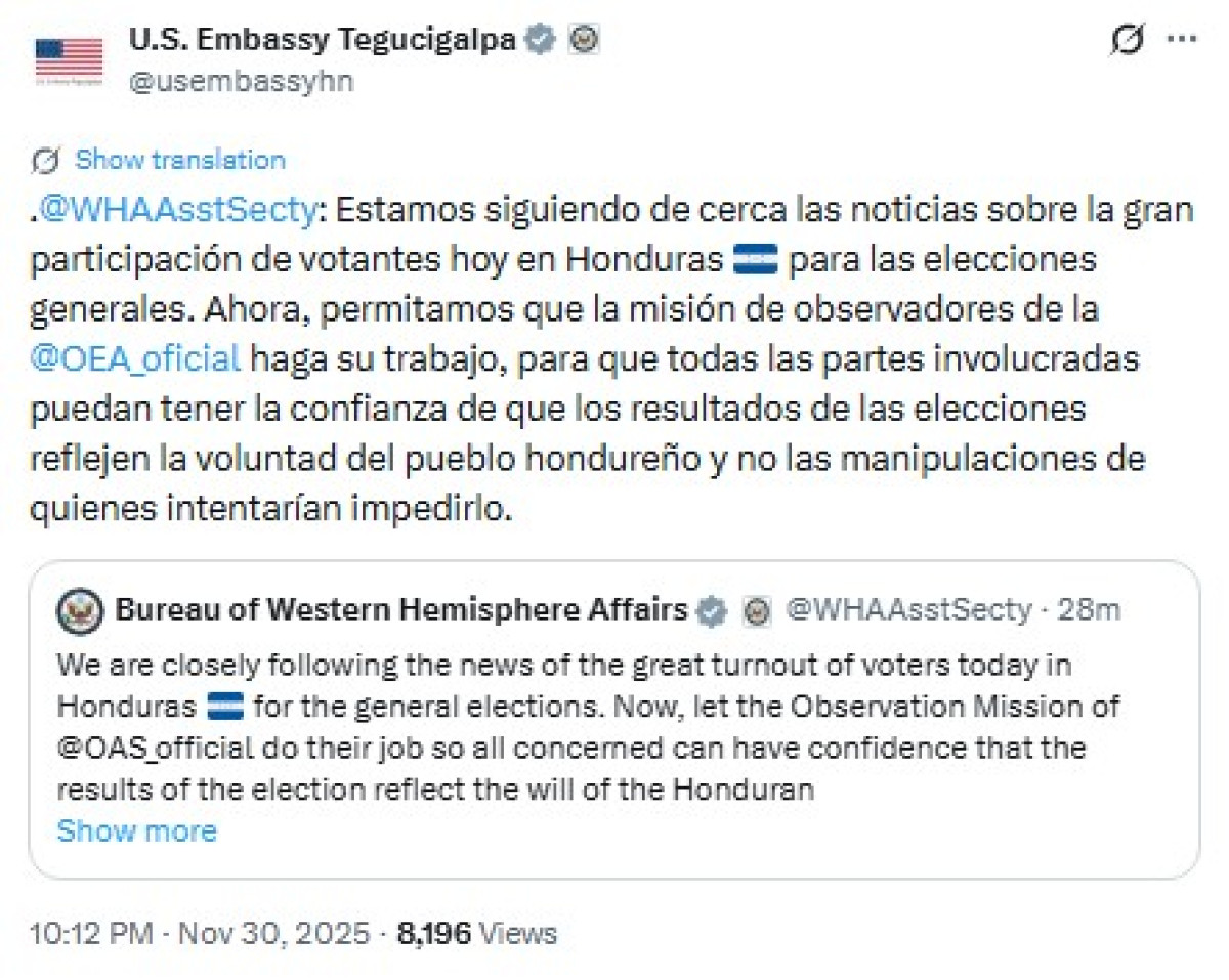 La Embajada de EE.UU. en Honduras asegura estar monitoreando las elecciones 2025 y pide a los observadores de la OEA "hacer su trabajo".