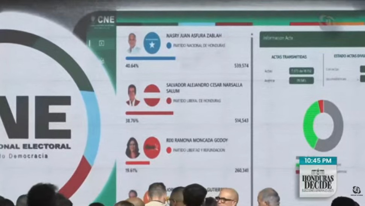Durante la noche del último martes, el CNE informó que se había procesado el 70% de las boletas electorales, según datos citados por Reuters. De acuerdo con los resultados preliminares del ente electoral, Salvador Nasralla lideraba el escrutinio con un 40,16% de los votos.