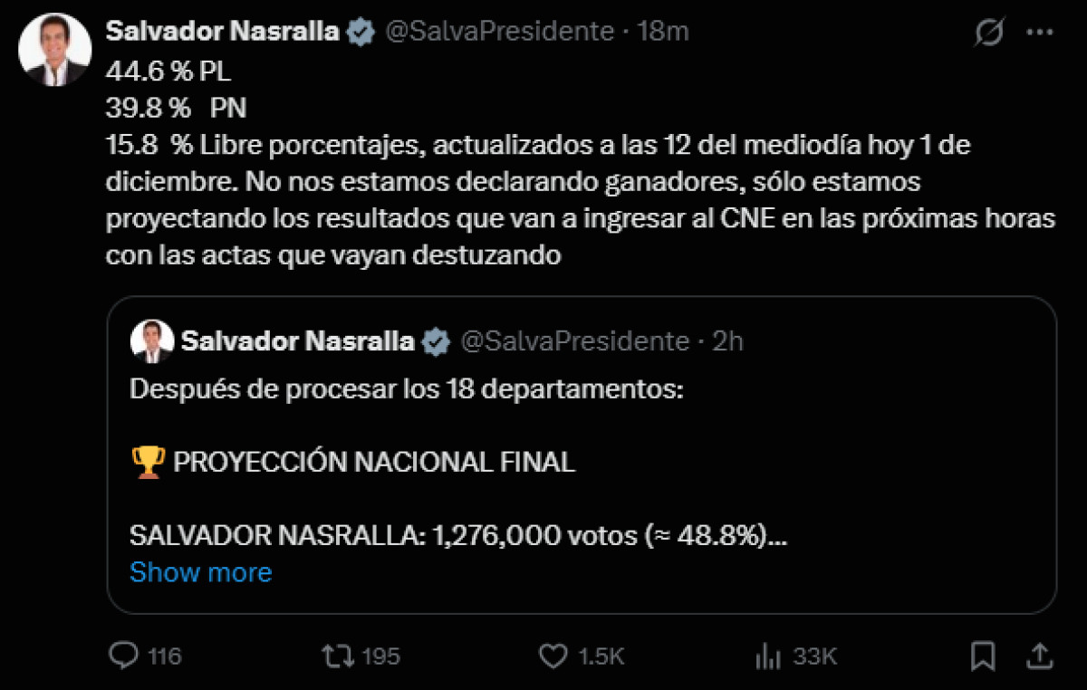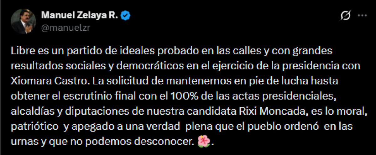 El expresidente hondureño Manuel Zelaya se pronunció en X tras el avance del conteo de votos, y pidió mantenerse “en pie de lucha” hasta que se publique el 100% de las actas presidenciales, alcaldías y diputaciones. Señaló que exigir el escrutinio total es un acto “moral, patriótico y apegado a la verdad que el pueblo ordenó en las urnas”.