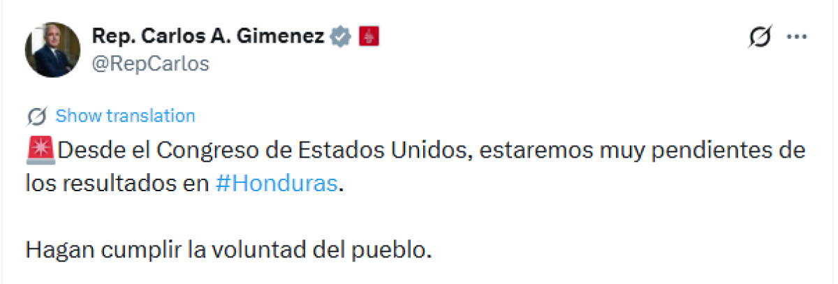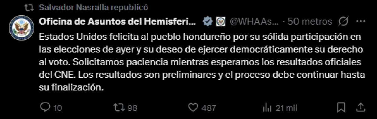 La Oficina de Asuntos del Hemisferio Occidental, entidad del Departamento de Estado de Estados Unidos encargada de coordinar la política exterior estadounidense hacia América Latina y el Caribe, emitió un mensaje sobre las elecciones en Honduras. La oficina felicitó al pueblo hondureño por su “sólida participación en las elecciones de ayer y su deseo de ejercer democráticamente su derecho al voto”.