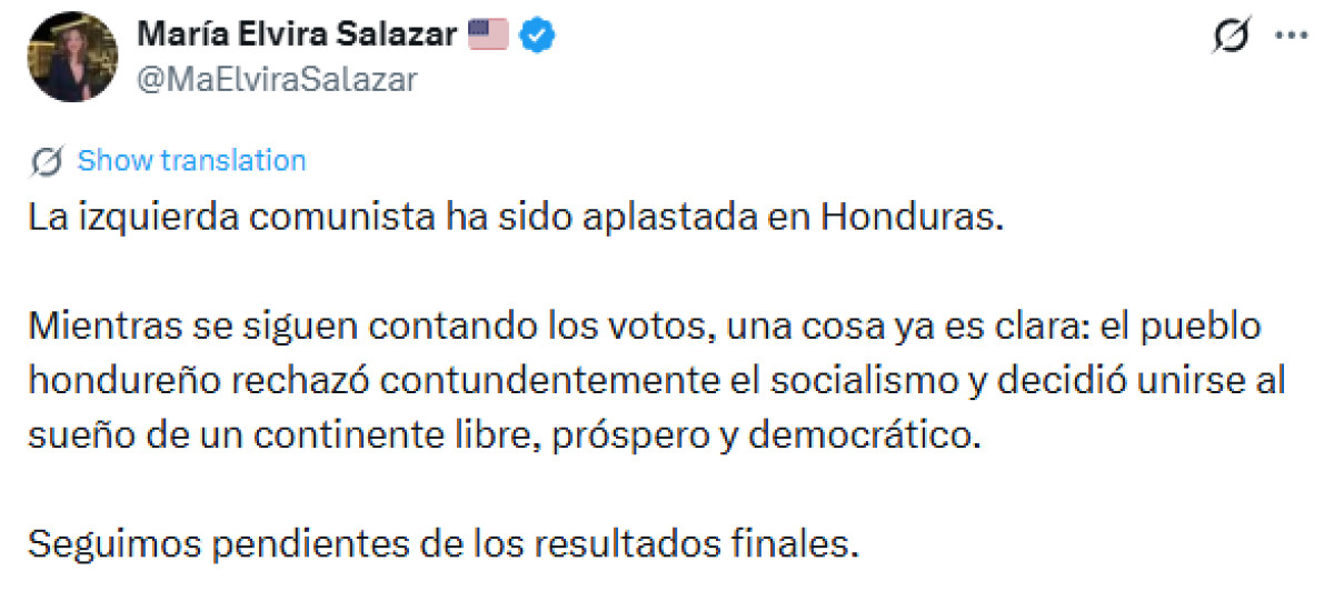 La republicana, María Elvira Salazar, reaccionó a los primeros conteos en Honduras calificándolos como “una derrota contundente para la izquierda” y afirmando que los hondureños “alzaron la voz por la libertad”. En X, la legisladora señaló que, aunque el escrutinio continúa, existe un mensaje claro en las urnas: “El pueblo hondureño rechazó el socialismo y decidió unirse al sueño de un continente libre, próspero y democrático”.