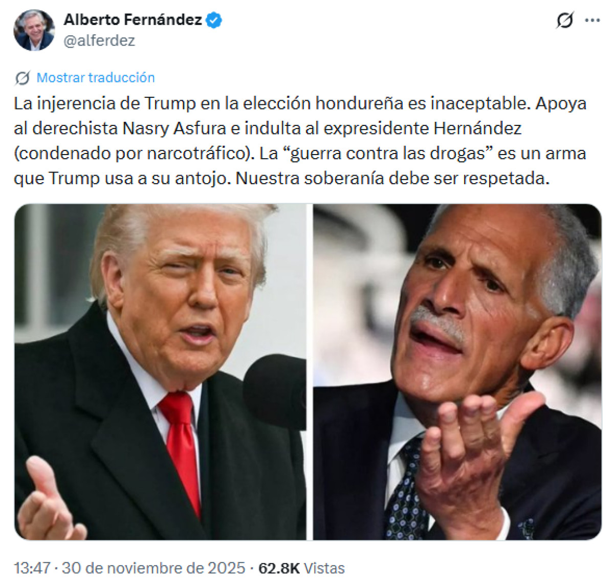 A través de su cuenta de Truth Social, el presidente de Estados Unidos alertó sobre un presunto intento de alterar las elecciones en el país centroamericano. "Parece que Honduras intenta alterar los resultados de sus elecciones presidenciales. ¡Si lo hacen, se armará un escándalo! El pueblo hondureño votó masivamente el 30 de noviembre. La Comisión Nacional Electoral, el organismo oficial encargado del recuento de votos, suspendió abruptamente el conteo a la medianoche del 30 de noviembre. El recuento mostró una reñida contienda entre Tito Asfura y Salvador Nasralla, con Asfura con una estrecha ventaja de 500 votos. El recuento se detuvo cuando solo se contabilizó el 47% de los votos. Es imperativo que la Comisión termine de contar los votos. Cientos de miles de hondureños deben contar sus votos. ¡La democracia debe prevalecer!", dijo.