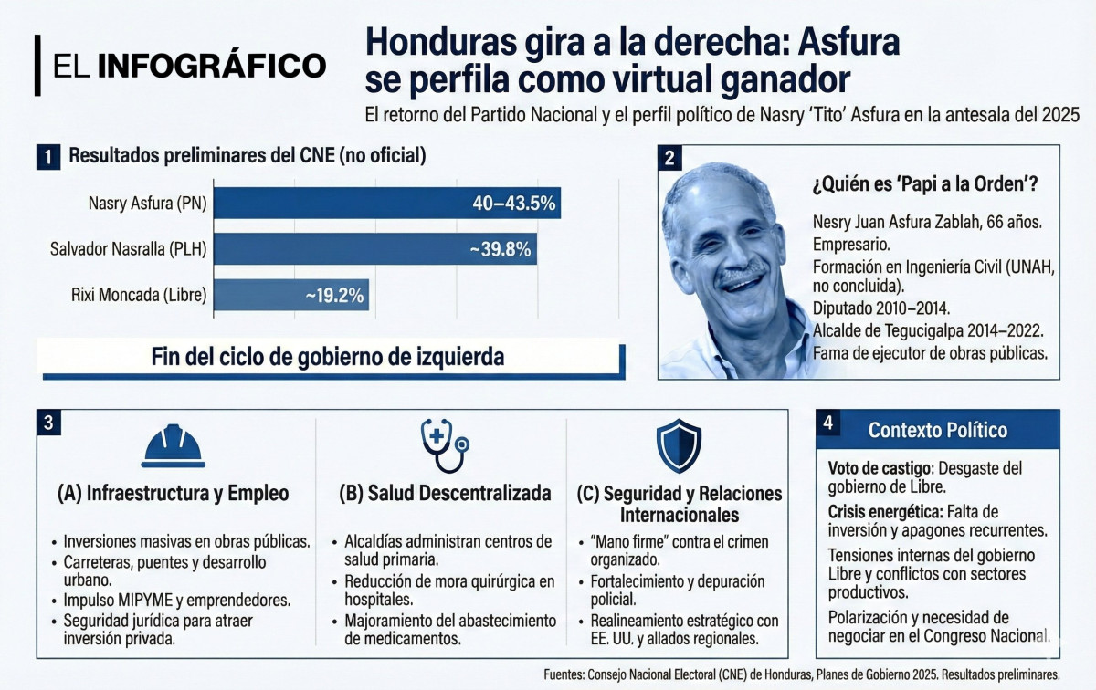 - Nasry Asfura (Partido Nacional – derecha): empresario de la construcción, exalcalde de Tegucigalpa, representa la línea conservadora tradicional.