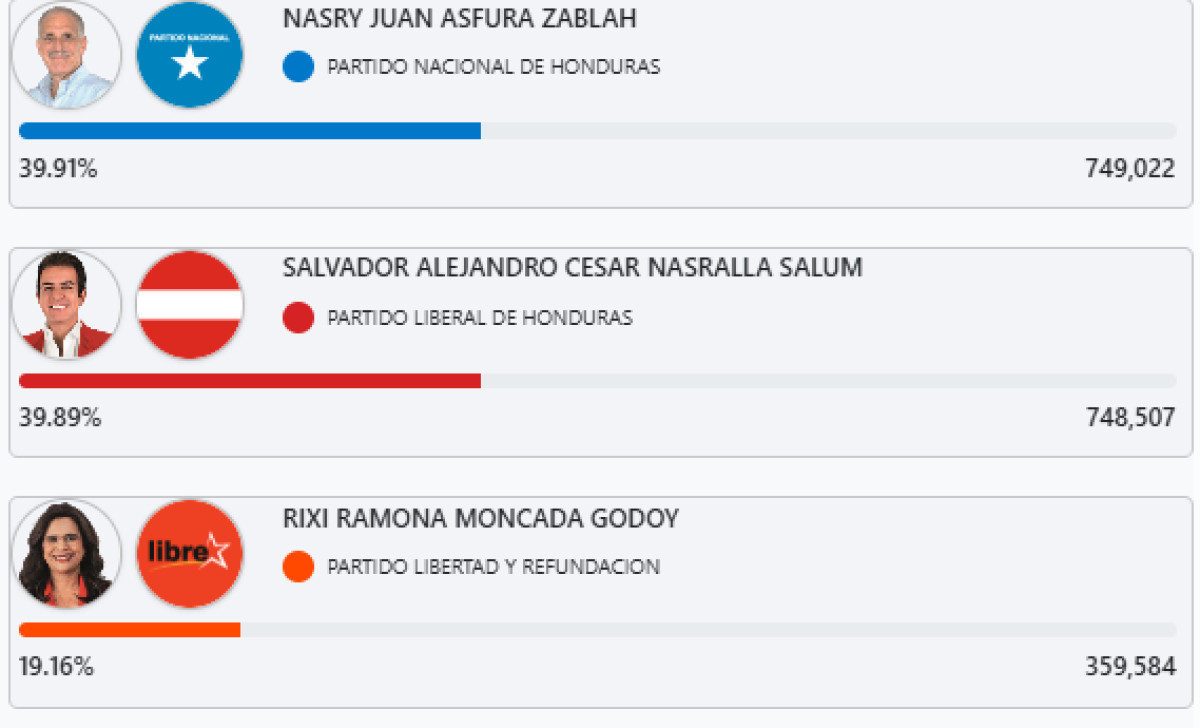 Por su parte, Nasry Asfura obtenía el 39,70%, lo que representaba una diferencia cercana a los 10.000 sufragios. En tanto, Rixi Moncada, del oficialista Partido Libre, se ubicaba en la tercera posición con el 19%.