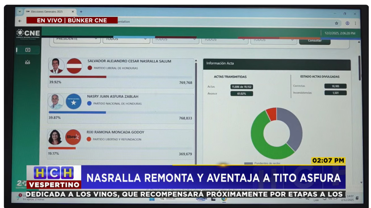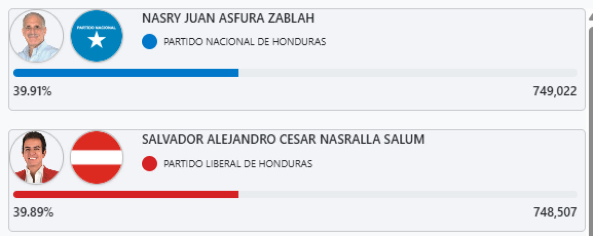 Salvador Nasralla, con 39,92%, supera a 'Tito' Asfura, con 39,87, según últimas actualizaciones del CNE.