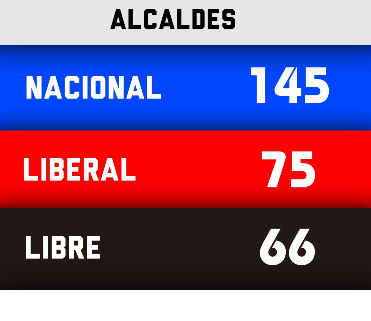 Así va el número de Alcaldías en Honduras, basado en los datos del sitio web de CNA Nacional: Nacional (145), Liberal (75), LIBRE (66) y PINU (1).