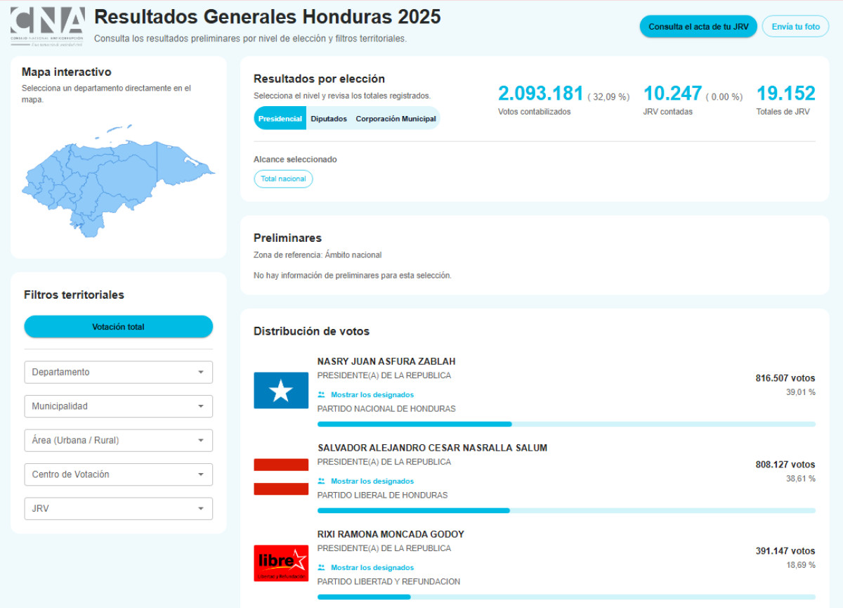 El Consejo Nacional Anticorrupción (CNA) lanzó una plataforma donde sus voluntarios proporcionaron las actas. Aquí, Asfura lidera con 816,152 votos, Nasralla le sigue cerca con 807 y 621 votos para Moncada. La diferencia es de 8,531 votos a favor de Asfura.