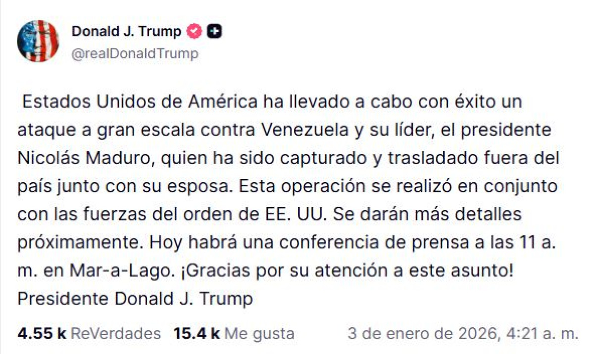 El presidente de Estados Unidos, Donald Trump, anunció a través de su red social Truth Social que Washington había llevado a cabo un ataque militar a gran escala contra Venezuela. Según Trump, la operación culminó con la captura de Nicolás Maduro y su esposa Cilia Flores, quienes, según él, fueron trasladados fuera del país en avión y puestos bajo custodia estadounidense. El mandatario estadounidense convocó una conferencia de prensa para dar más detalles del operativo.