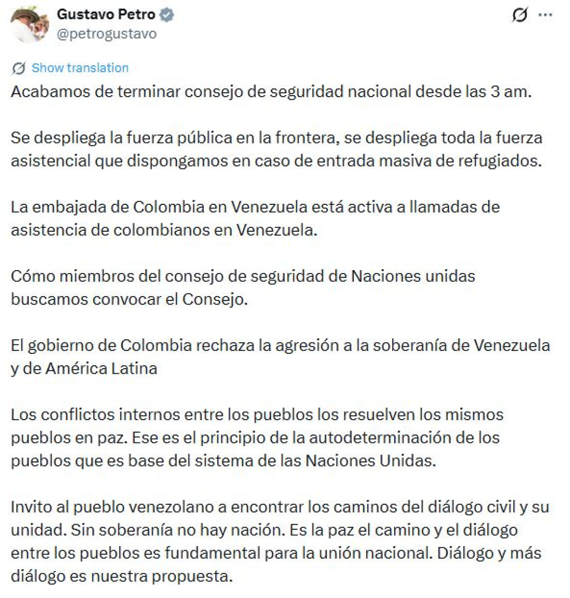Petro calificó estas acciones como una "agresión a la soberanía" de América Latina y advirtió que podrían generar una crisis humanitaria. Aunque propuso que la situación se resuelva a través del diálogo, el mandatario colombiano también destacó que la medida incluye el despliegue de la fuerza pública en la frontera, donde operan varios grupos armados ilegales financiados por el narcotráfico.