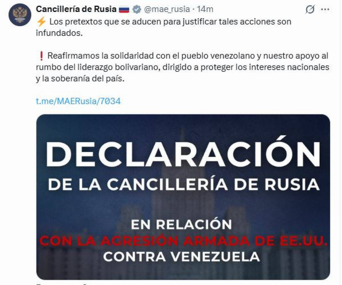 Rusia condenó la acción militar de Estados Unidos en Venezuela, asegurando que no había justificación para el ataque y que la "hostilidad ideológica" había prevalecido sobre la diplomacia. El Ministerio de Relaciones Exteriores de Rusia calificó el hecho como "profundamente preocupante y condenable", destacando su rechazo a la intervención militar y subrayando la falta de bases legales para la agresión.