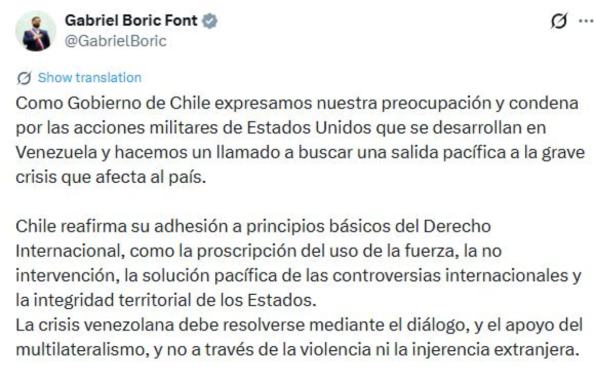 Mediante un comunicado en su cuenta de X, antes Twitter, el presidente chileno Gabriel Boric condenó las acciones de Estados Unidos en Venezuela.