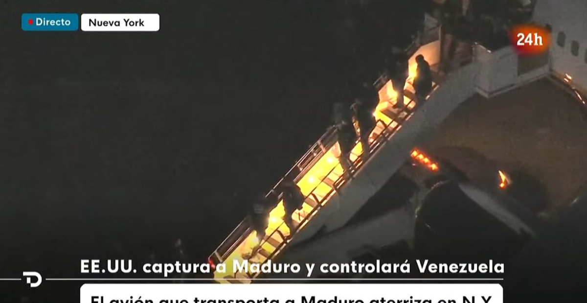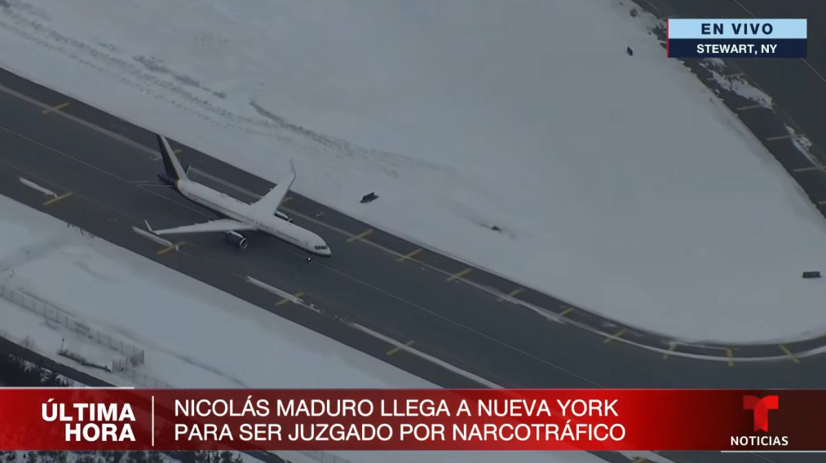 Televisión internacional anuncia la llegada de Nicolás Maduro a Nueva York para ser juzgado por narcotráfico junto a su esposa. El avión aterrizó en la base aérea Stewart.