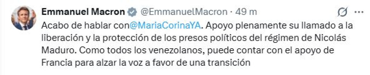 "Como todos los venezolanos, puede contar con el apoyo de Francia para alzar la voz a favor de una transición", aseguró Emmanuel Macron, presidente francés.