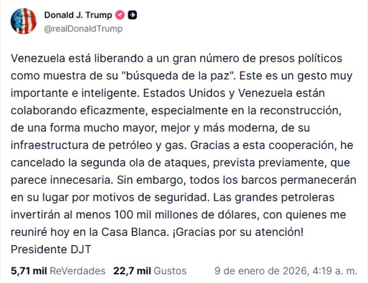 El presidente Donald Trump anunció en una publicación en Truth Social que había cancelado una segunda oleada de ataques previamente planeada contra Venezuela, gracias a la cooperación de ese país con Estados Unidos. Trump destacó que la liberación de un número significativo de presos políticos en Venezuela es un acto que señala una "búsqueda de la paz", calificándolo como "un gesto importante e inteligente". Además, el mandatario mencionó que ambas naciones están trabajando bien juntas en el ámbito de la reconstrucción, especialmente en la modernización de la infraestructura petrolera y de gas de Venezuela.