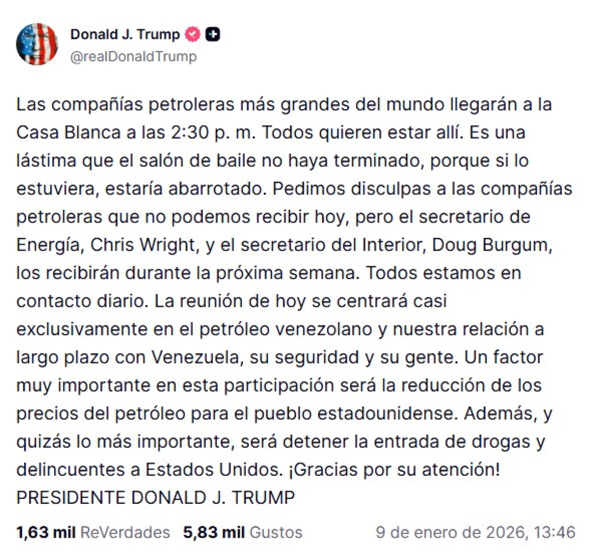 - Control presidencial: Trump aseguró que “personalmente decidirá qué compañías petroleras podrán entrar a Venezuela”.