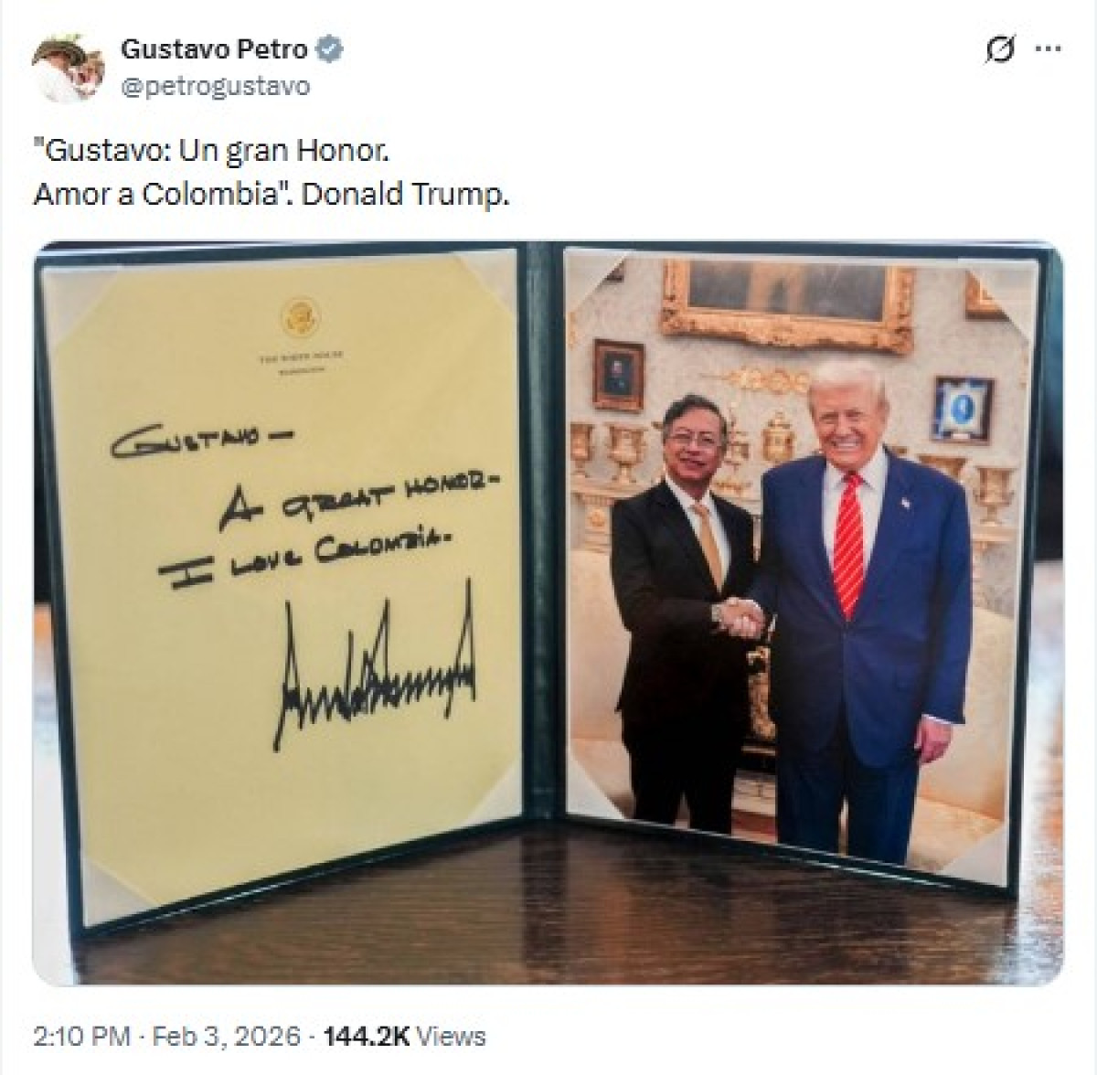 Gustavo Petro difundió en X una fotografía del documento oficial que recibió de Donald Trump. El impreso con membrete incluye una imagen de ambos líderes en la Oficina Oval junto a una dedicatoria escrita a mano donde el republicano expresa que la visita fue un honor y envía su afecto al país andino.