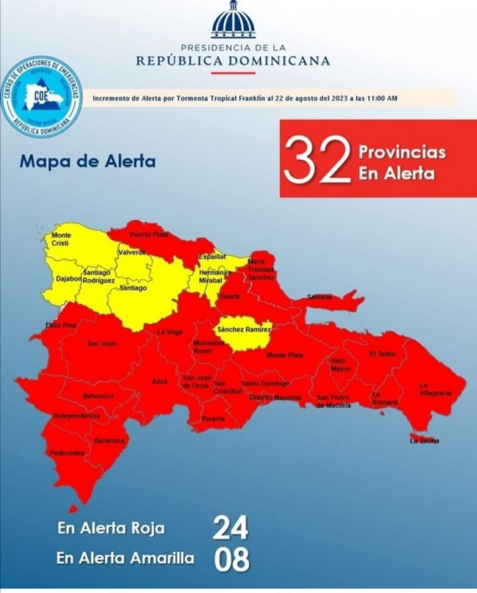 El COE coloca 14 provincias en alerta roja y 18 en amarilla por posibles crecidas de ríos, arroyos y cañadas, así como inundaciones repentinas o urbanas, debido a que el centro de la tormenta Franklin se ubica a pocos km al sur de Santo Domingo.