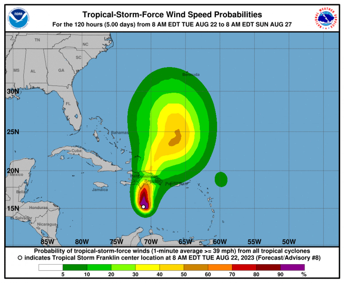 Franklin girará hacia el noreste y luego hacia el este-noreste con una disminución en la velocidad de avance este jueves y este viernes. En la trayectoria pronosticada, el centro de Franklin continuará alejándose de la República Dominicana y luego se moverá sobre el suroeste del Atlántico durante el fin de semana